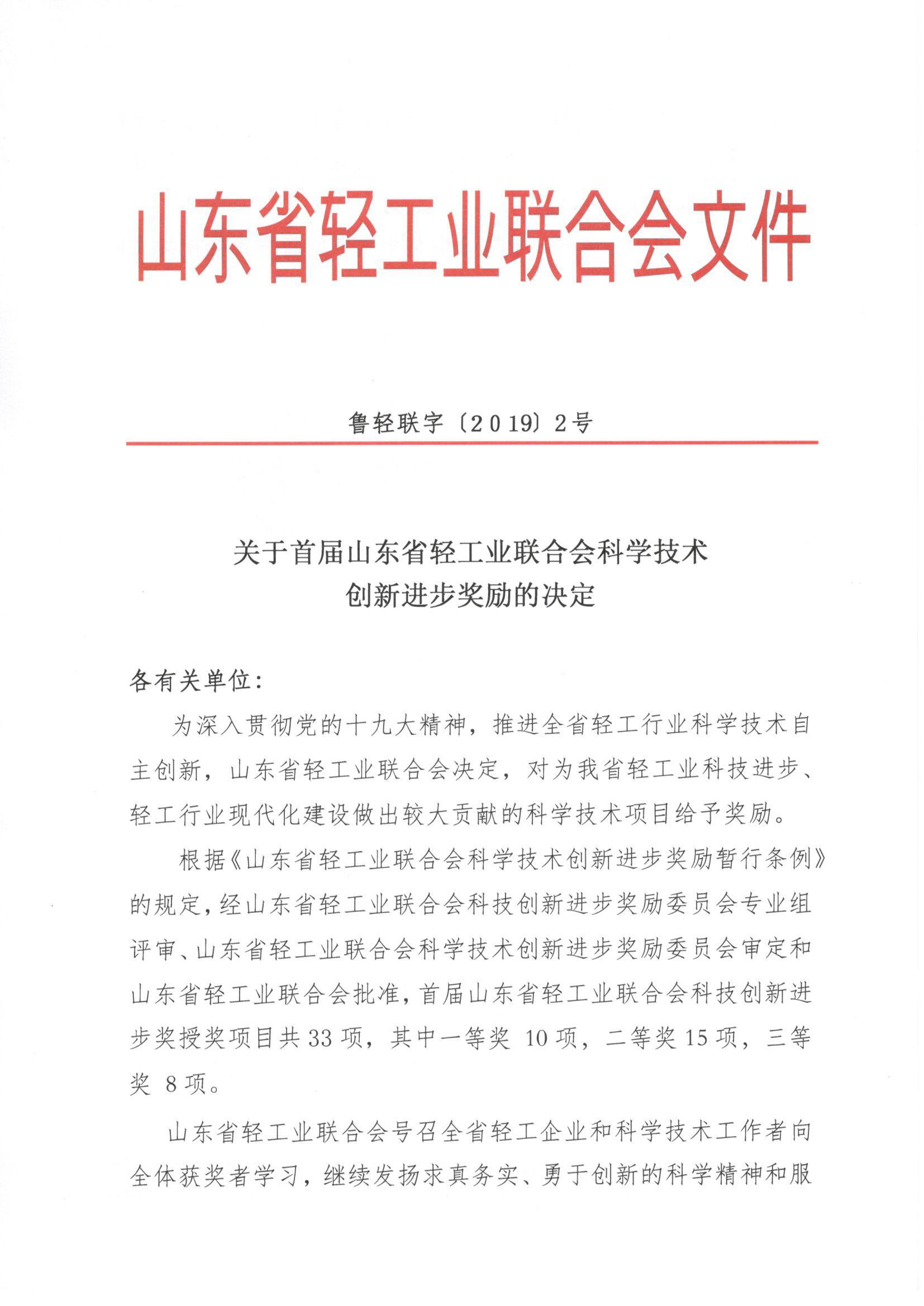 關(guān)于首屆山東省輕工業(yè)聯(lián)合會科學(xué)技術(shù)創(chuàng)新進(jìn)步獎勵(lì)的決定